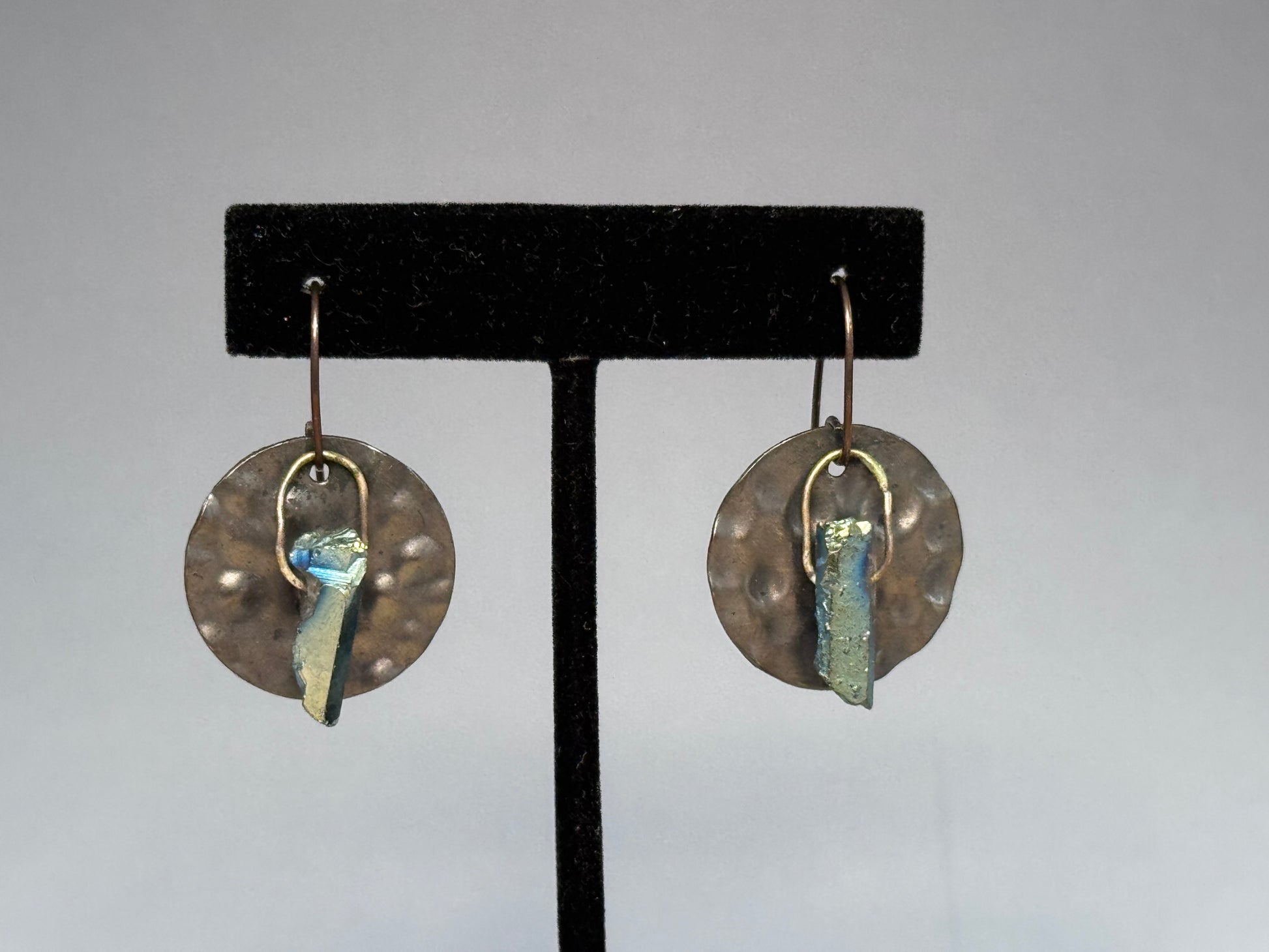 Oxidized copper discs with iridescent crystals. Niobium ear wires. ~1.5" high.
