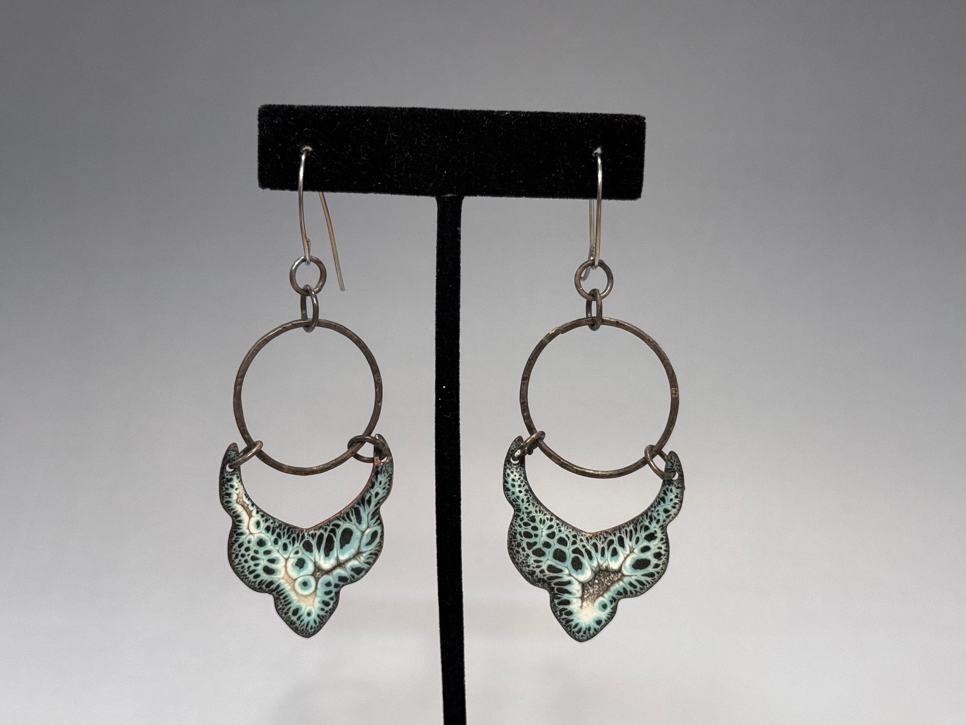 Some of my favorites! These are oxidized silver with a torch-fired enameled copper dangle that features multiple layers of colored glass, heated to intentionally crackle and form this beautiful pattern. Sterling ear wires. Lightweight. ~3.25" high.