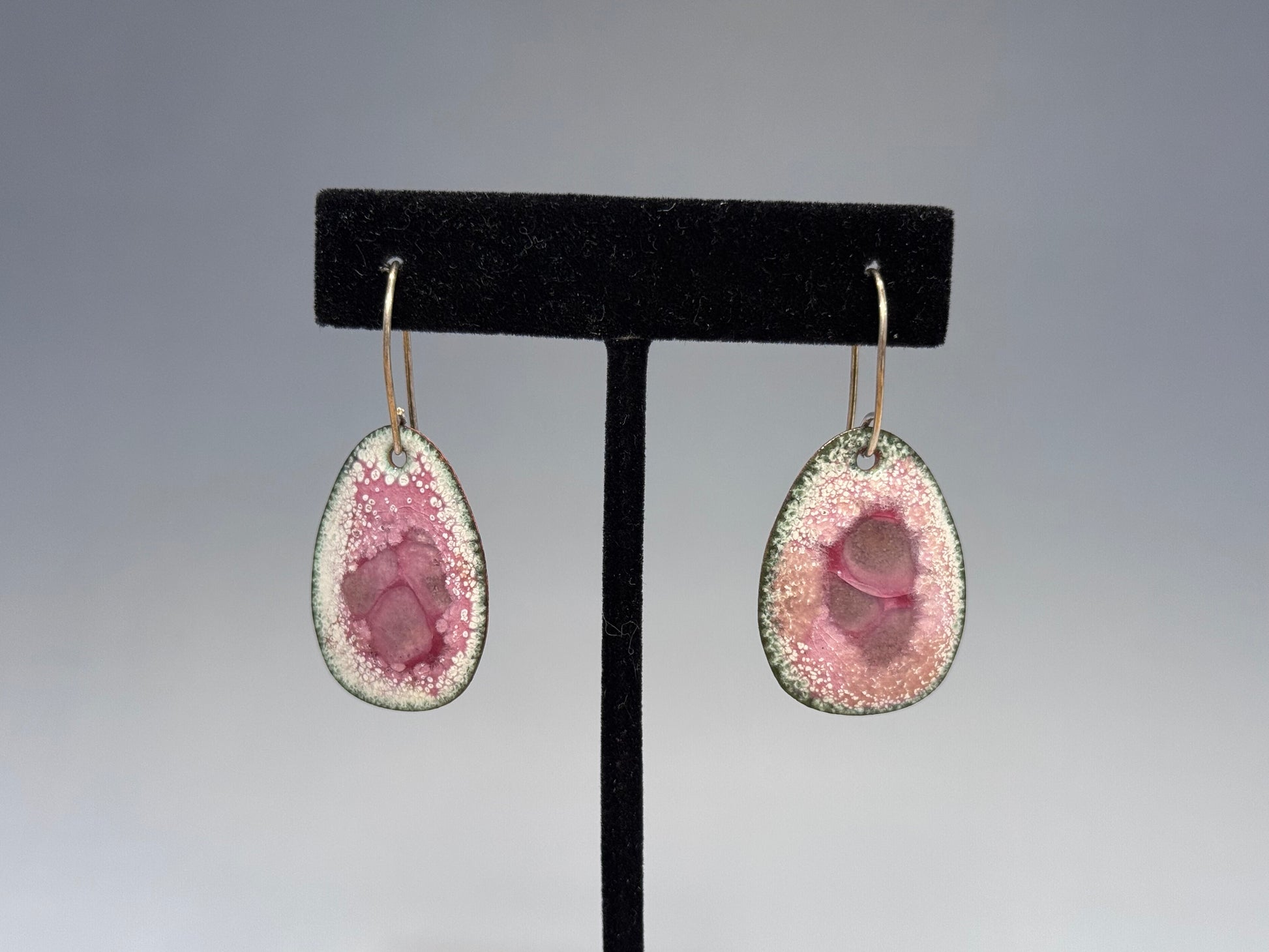 Torch-fired enamel earrings with an iridescent center. Sterling ear wires. Note: because of the process and materials used to make these, they are fired at high heat which results in dark markings / discoloration on the back side. 1.75” high.