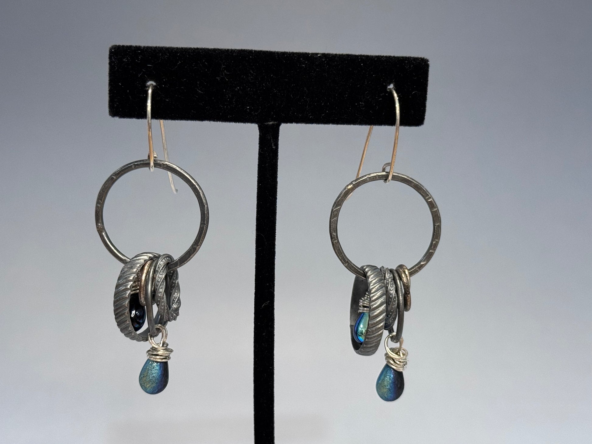 These are so pretty and so easy to wear. Multiple sterling loops and iridescent beads dangle from a large circle. Sterling ear wires, lightweight. ~2.5" high.