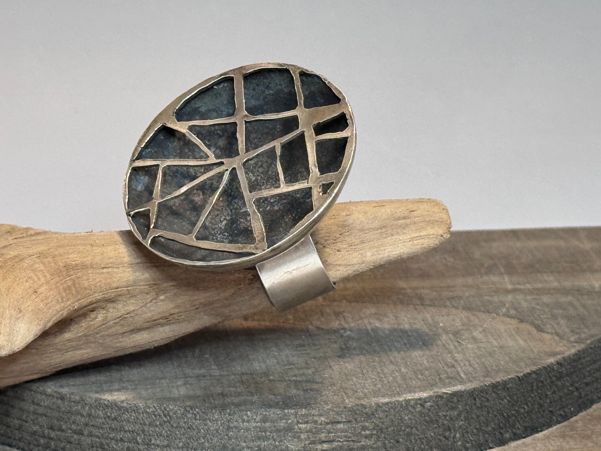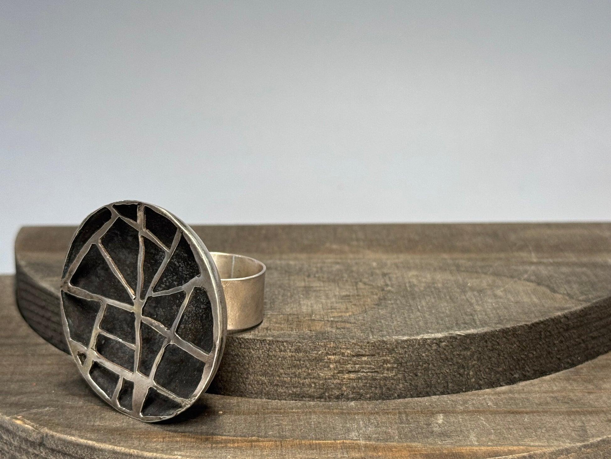 This is a cool one! Hollow silver cup that's oxidized inside, with a shiny silver design on top. Size 7. Measures 1.75" across.