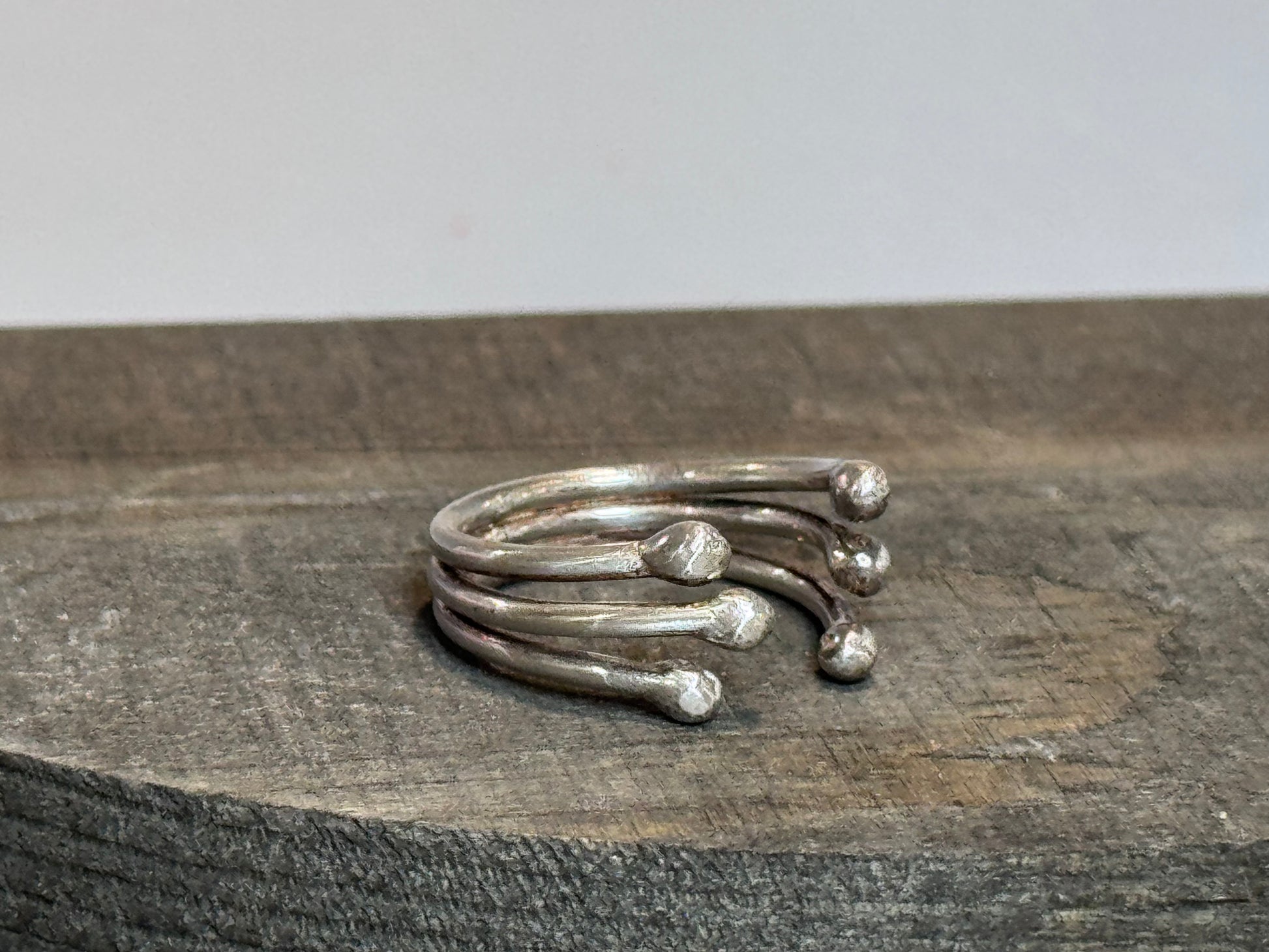 One of my favorite designs! The opening in front makes the ring adjustable from sizes ~5-8. Looks great worn alone or stacked with other rings. Sterling.