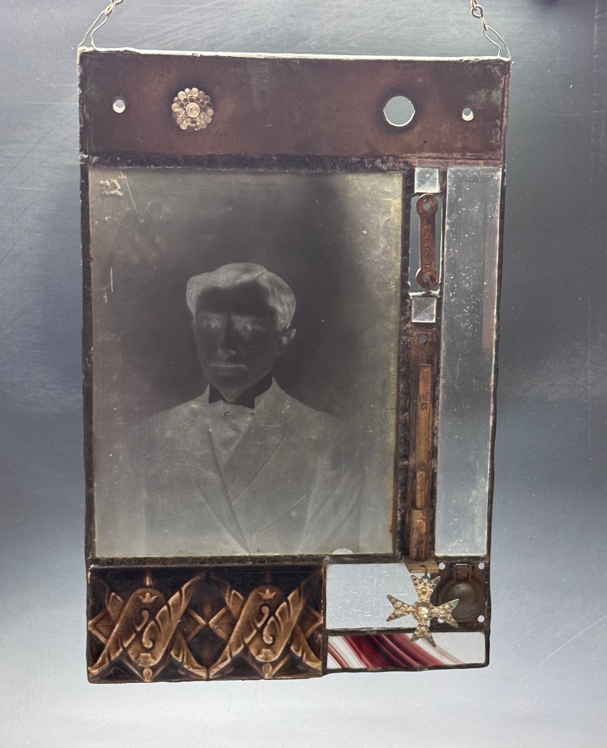 This window is made from found objects including hardware, jewelry, and a tile I rescued from a house that was being torn down in Lambertville, NJ. The glass negative is very dark but you can see the ghostly image when bright light shines through from behind. ~10"w x 15"h.